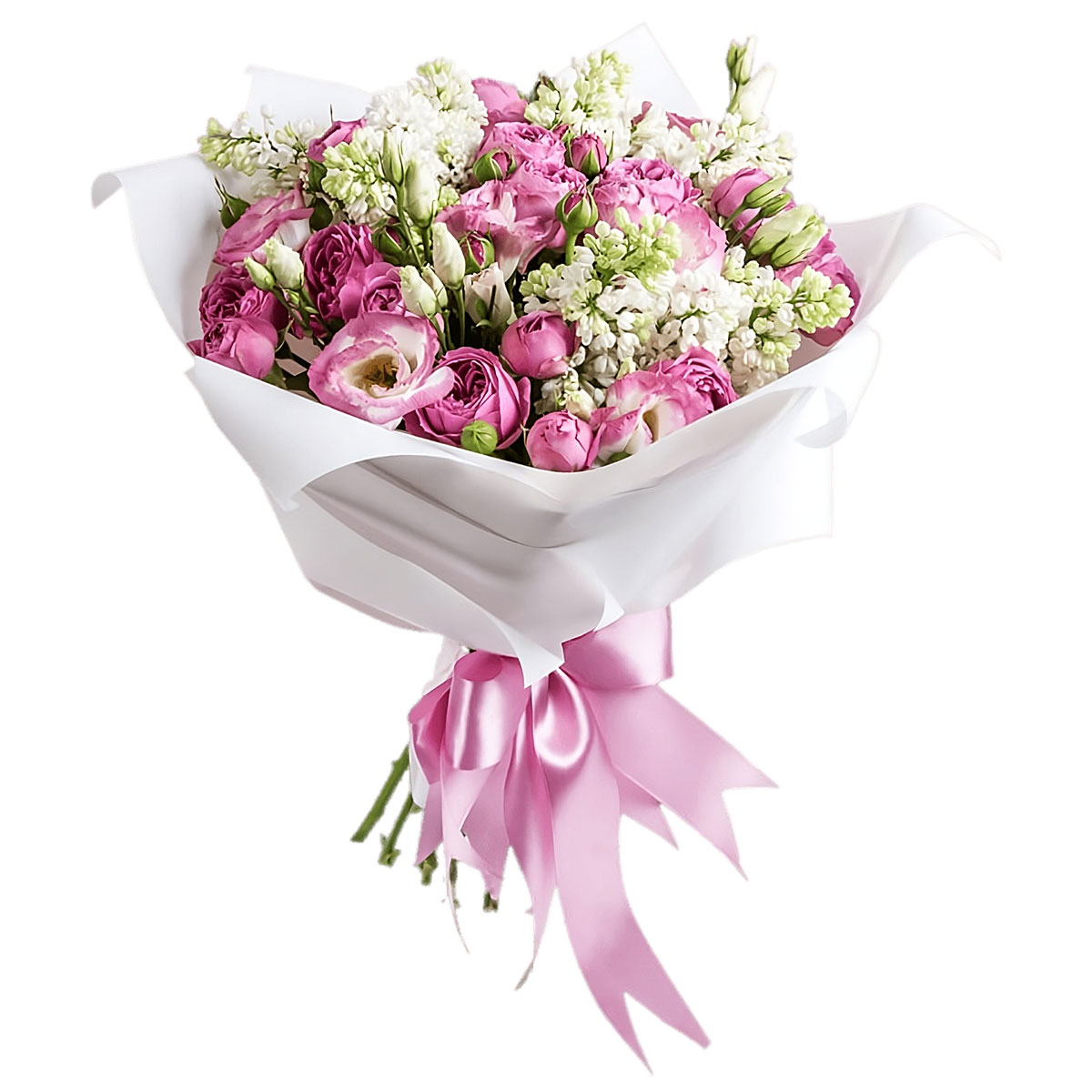 Эустома розовая, маттиола белая, сирень белая, роза кустовая бомбастик розовая. Упаковка (лента, пленка, крафт, сетка, пленка матовая)