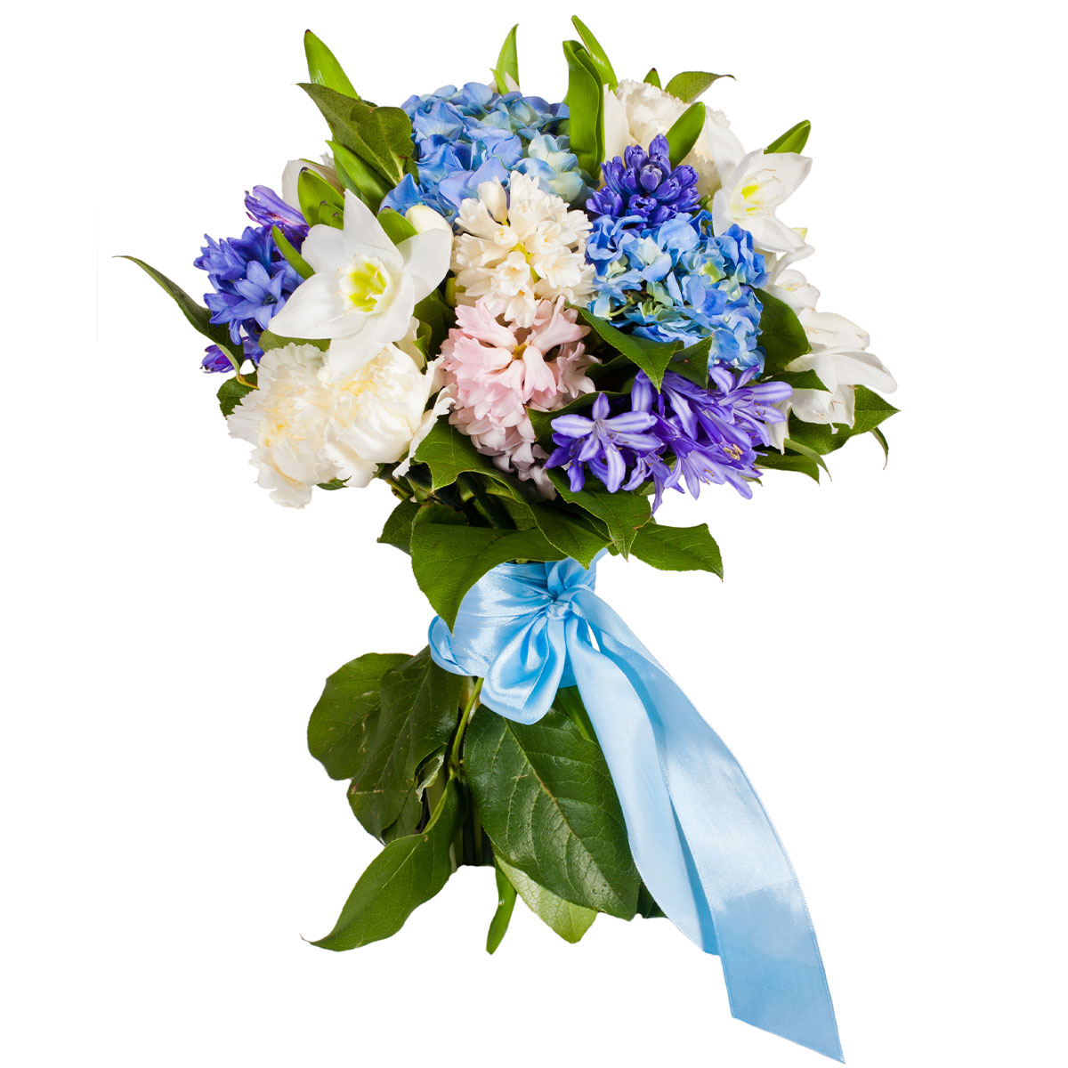 Гиацинт белый, синий и розовый, гортензия голубая, нарцисс белый, агапантус. Упаковка (лента, пленка, крафт, сетка, пленка матовая)