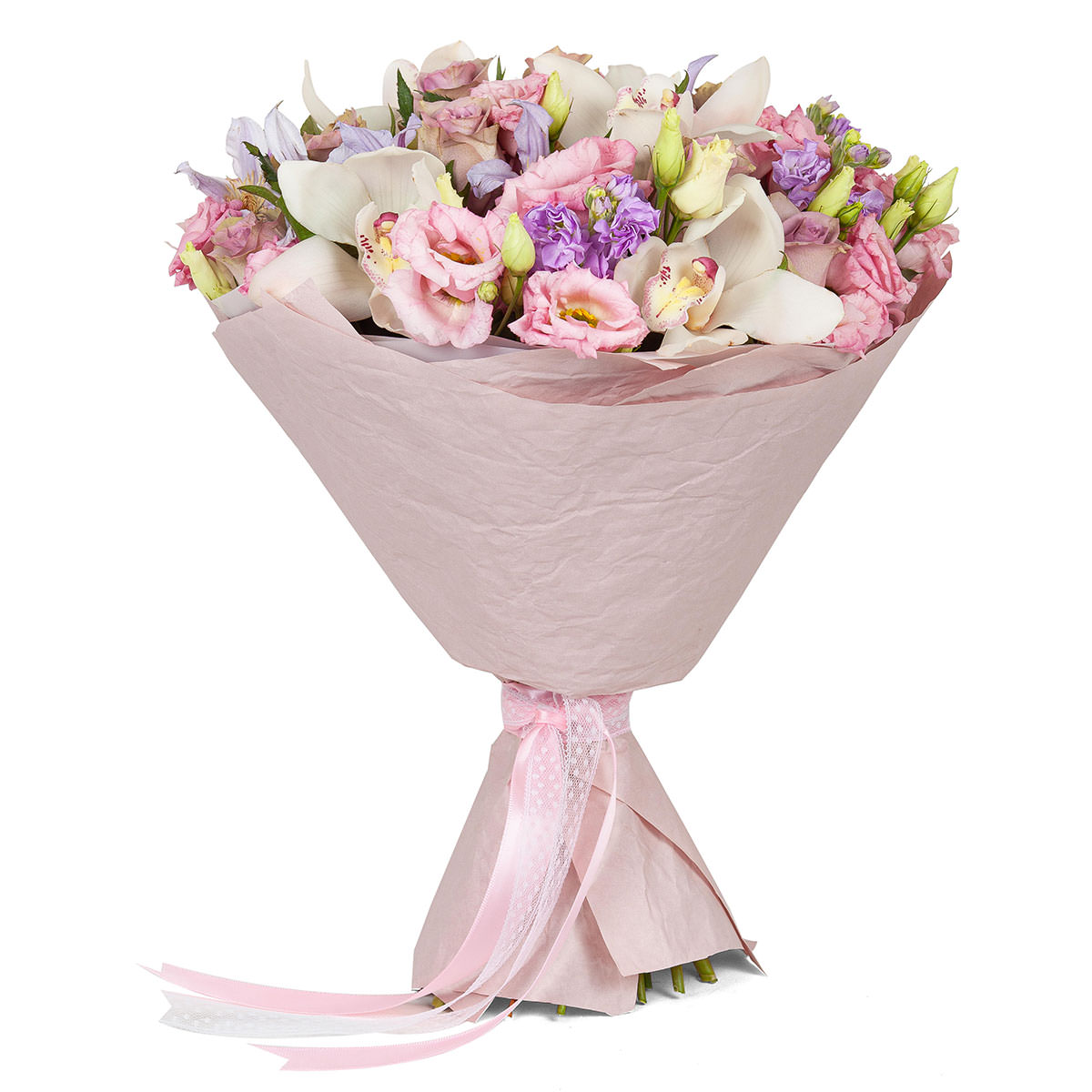 Орхидея белая, эустома розовая, маттиола сиреневая. Упаковка (лента, пленка, крафт, сетка, пленка матовая)