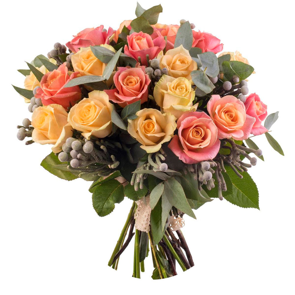 Роза одноголовая микс (желтая, персиковая), бруния, эвкалипт. Упаковка (лента, пленка, крафт, сетка, пленка матовая)