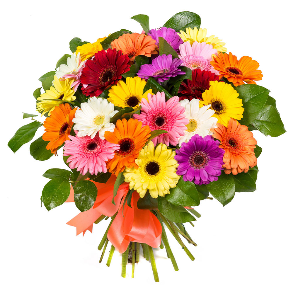 Герберы микс (белая, желтая, оранжевая, розовая, красная, фиолетовая), зелень. Упаковка (лента, пленка, крафт, сетка, пленка матовая)