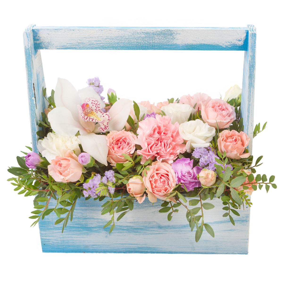 Орхидея белая, роза кустовая розовая, гвоздика розовая, эустома белая, статица, фисташка. Упаковка (Корзина, оазис, ящик).