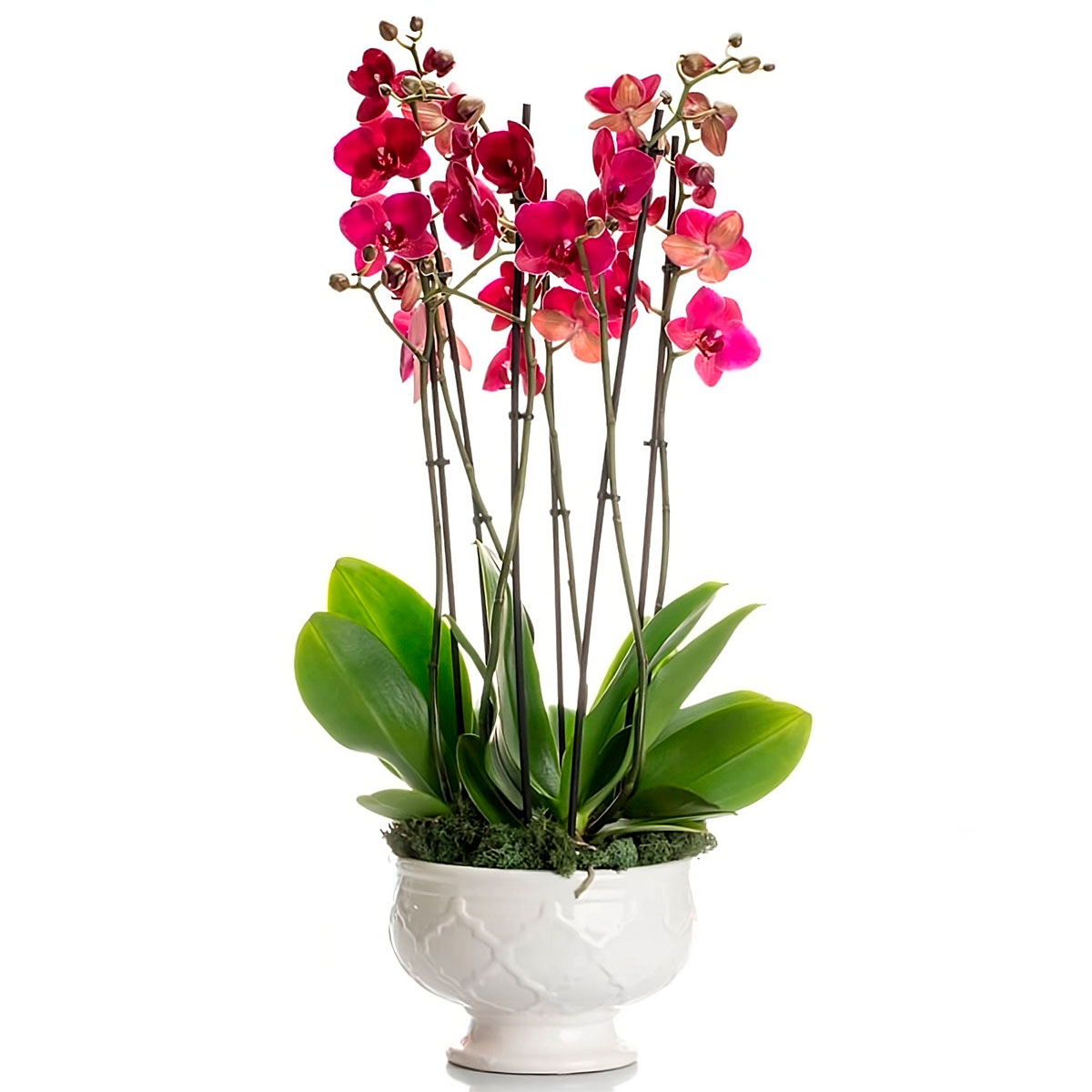 Бордово-розовая орхидея в горшке — экзотическая красота и роскошь в каждом цветке. Это стильное и эффектное дополнение к интерьеру любого помещения, от домашней комнаты до офиса. Благодаря глубокому бордово-розовому цвету, этот цветок выделяется на любом фоне и приковывает к себе взгляды. Подарите эту орхидею своим близким или коллегам, чтобы привнести в их жизнь кусочек тропического рая.