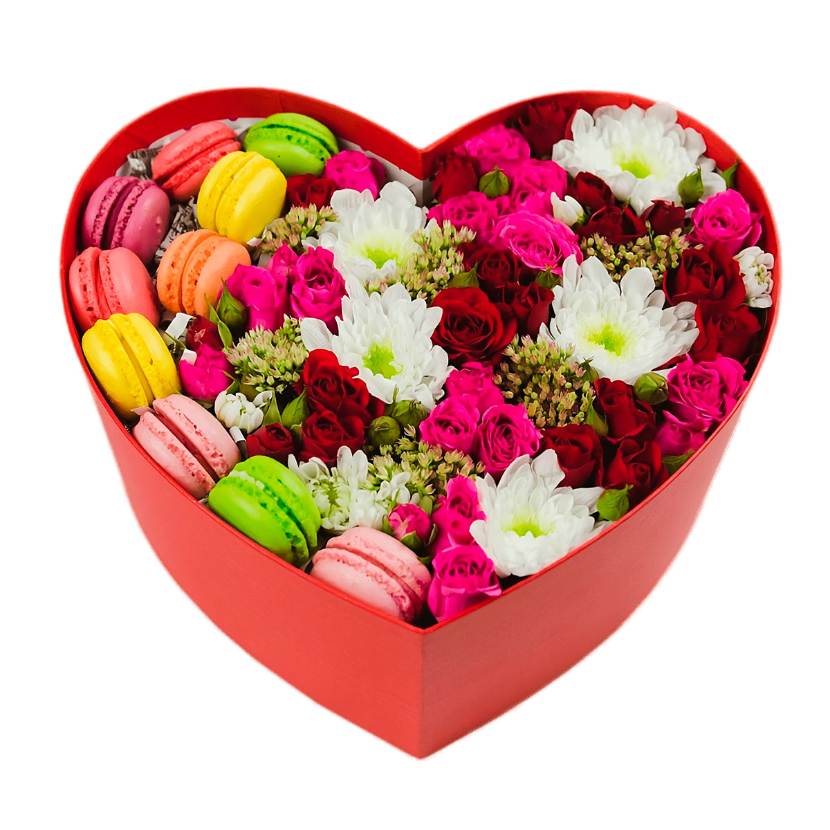 Роза кустовая микс (красная, розовая), кустовая хризантема белая, макаронс. Упаковка (шляпная коробка, квадратный бокс, коробка сердце, оазис)