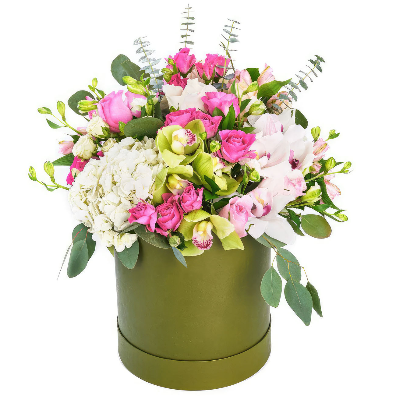 Гортензия белая, роза кустовая розовая, орхидея зеленая, белая, роза одноголовая розовая, альстромерия розовая, эвкалипт. Упаковка (шляпная коробка, квадратный бокс, коробка сердце, оазис)