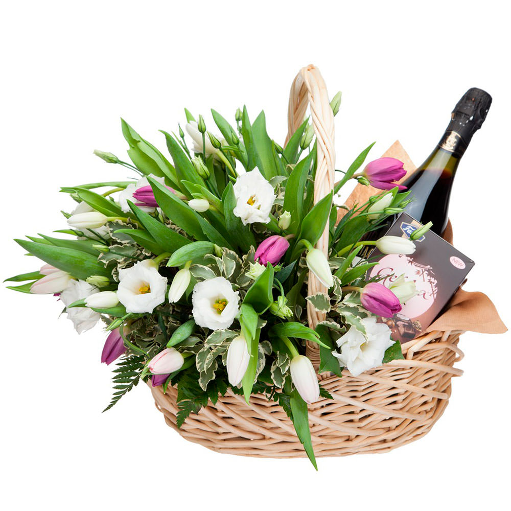 Эустома белая, тюльпаны микс (сиреневый, белый), питтоспорум. ( Напиток добавляется по желанию на выбор, уточняйте у менеджера ) Упаковка (Корзина, оазис).